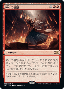 3マナで3点全体火力のカードは過去に《神々の憤怒》、《焼けつく双陽》のようなカードがありましたが、これらとは異なり、プレインズウォーカーにもダメージを与えられることが画期的ですね。